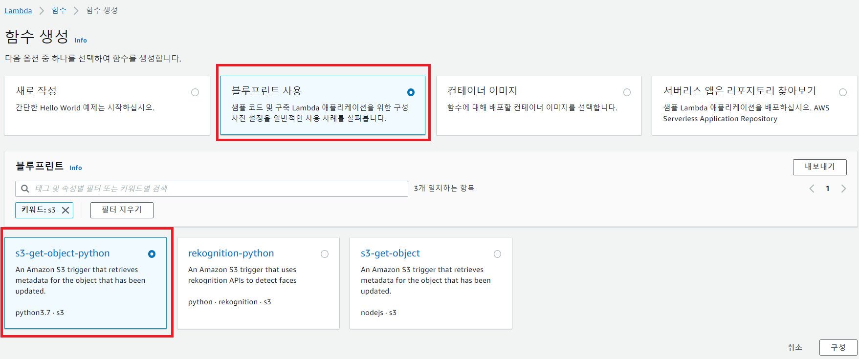 S3 Object 관련된 블루프린트를 이용하여 Function을 생성한다.