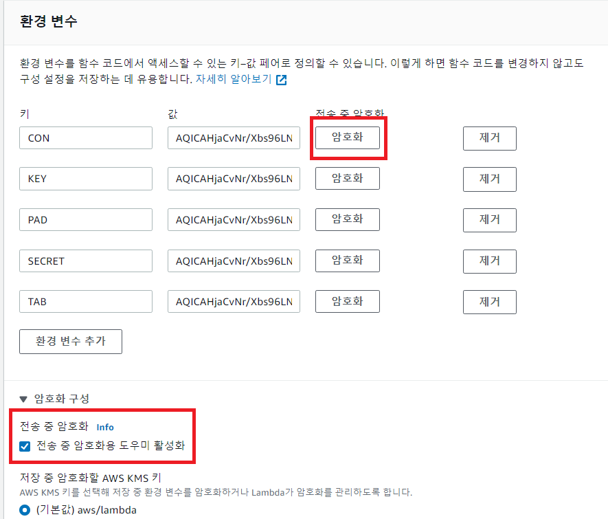 환경변수를 KMS에서 만든 Key로 암호화를 하였다.