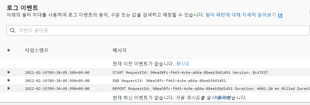 [모니터링] - [CloudWatch에서 로그 보기]에서 확인할 수 있다.
