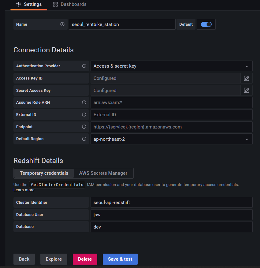 Grafana에서 Redshift Data를 읽어오려면 먼저 Datasource를 등록해서 연결해줘야 한다.