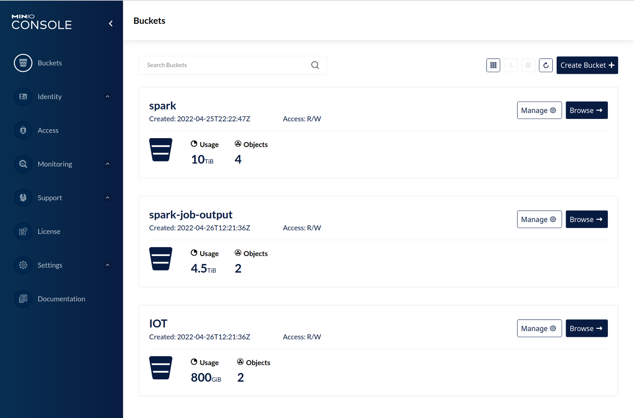 MinIO 실행시 설정한 Console IP, Port로 들어가본다.