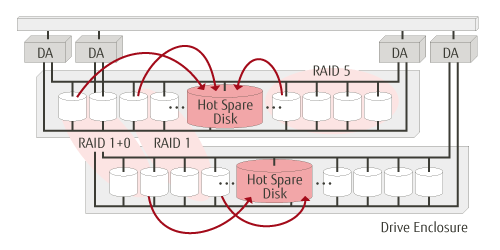 Hot spare disks are preparatory disk drives that are kept on active standby for use when a disk drive fails. The Global Hot Spare function enables hot spare disks to be used for any RAID group.
