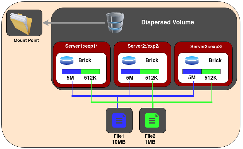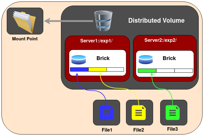 - Distributed Volume -> 각 Brick에 File단위로 분산 저장