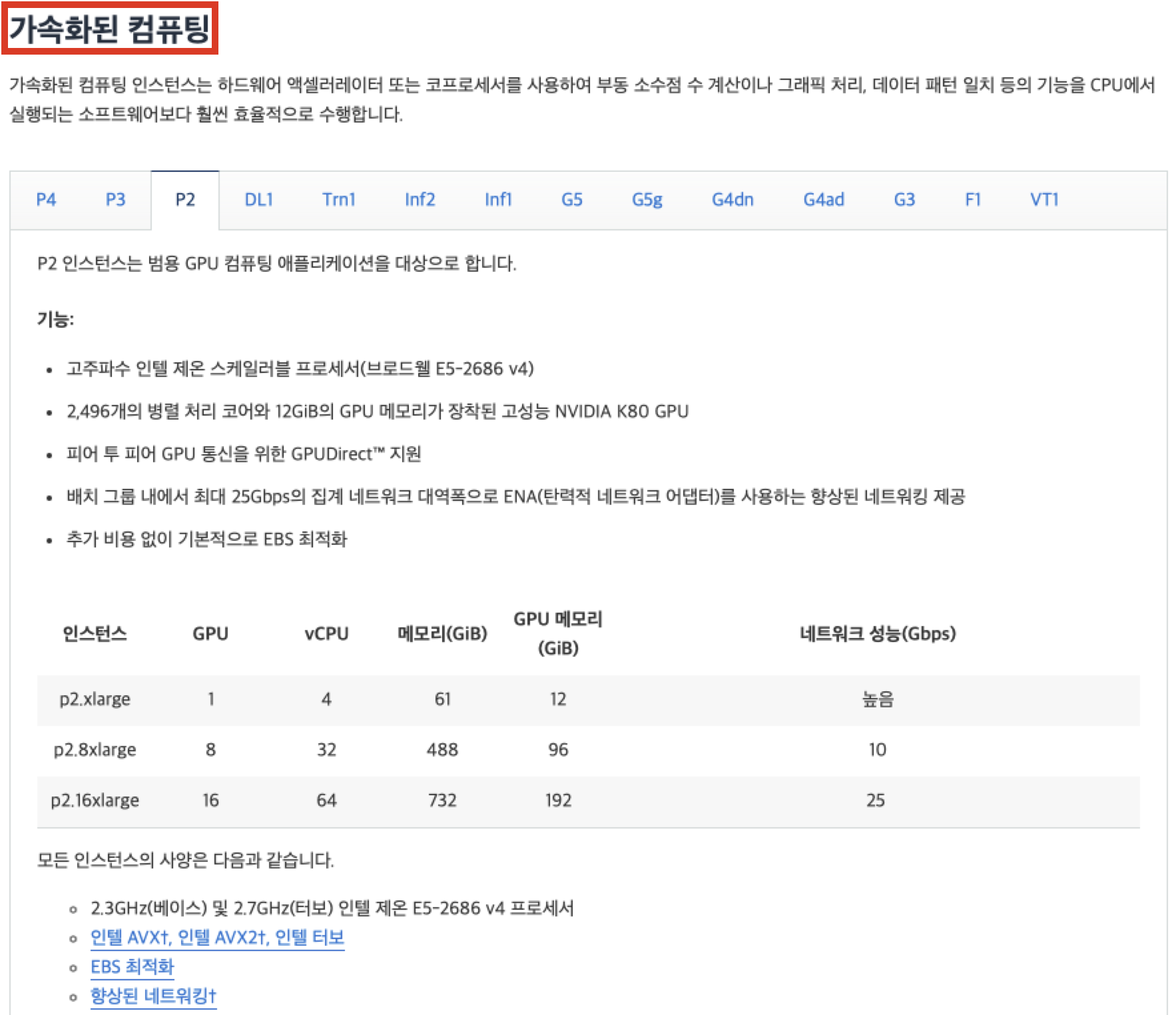 - P3 인스턴스는 Nvidia Tesla V100 GPU 사용