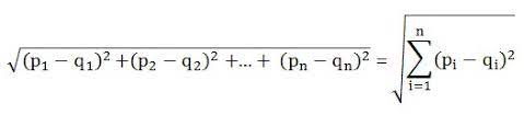 유클리디안 거리는 각 차원의 차를 제곱해서 모두 더한 값의 제곱근입니다.