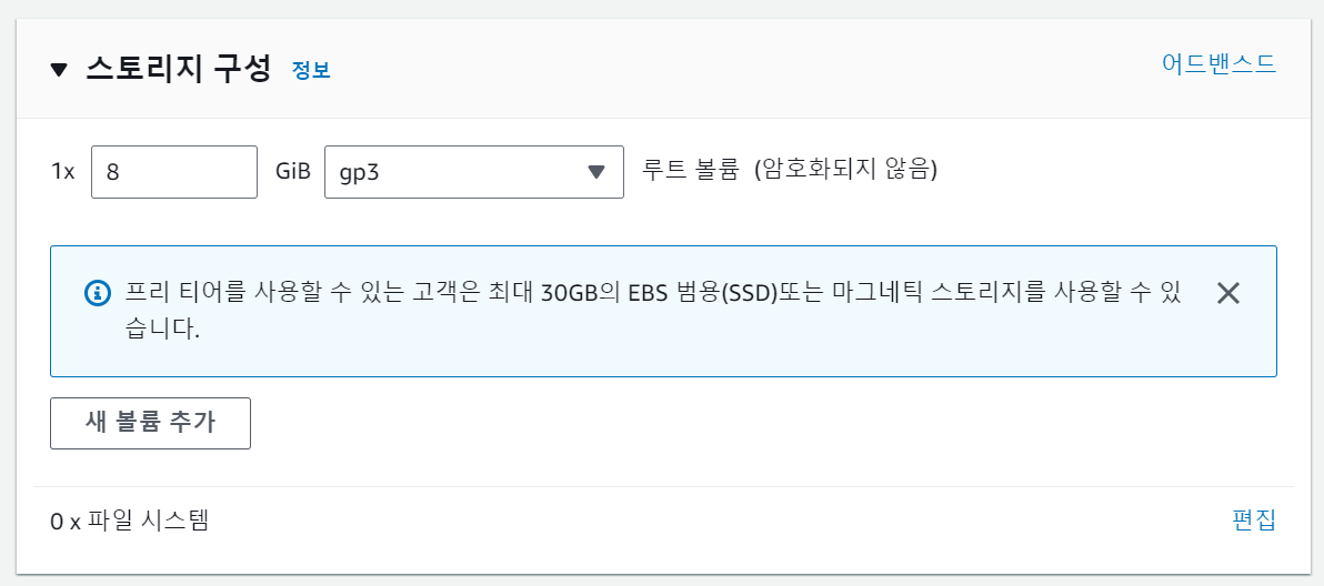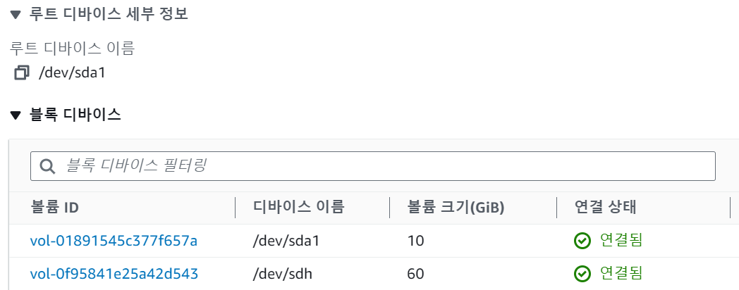 Root Volume은 최소한으로 구성하고 따로 EBS를 생성한 후 mount 하여 사용하였습니다.