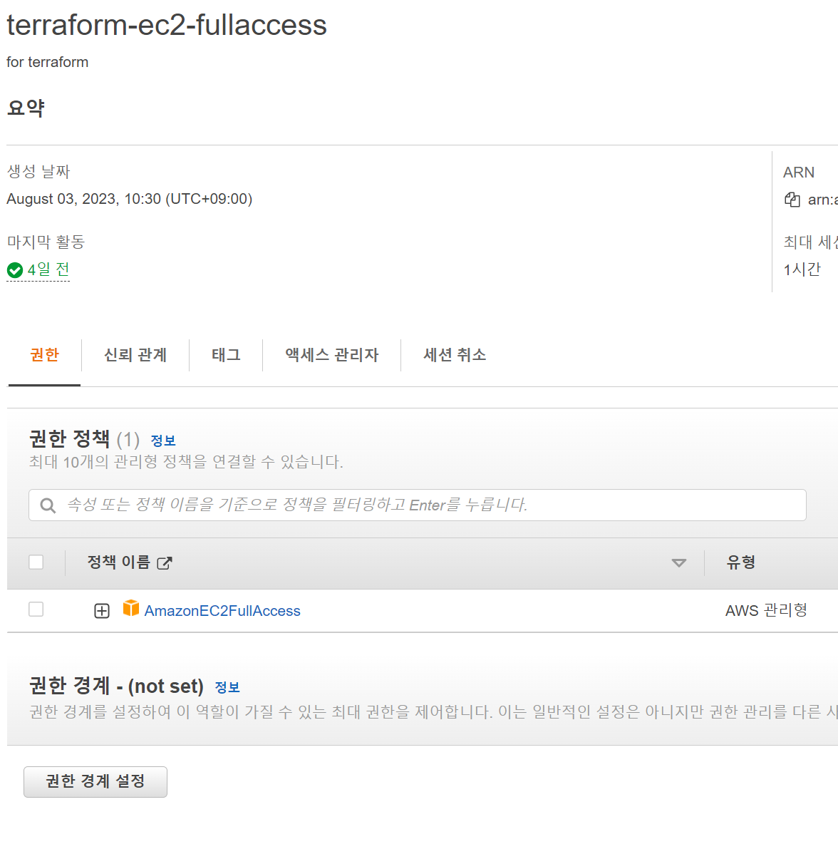 AmazonEC2FullAccess 권한을 가진 역할을 생성하였습니다.