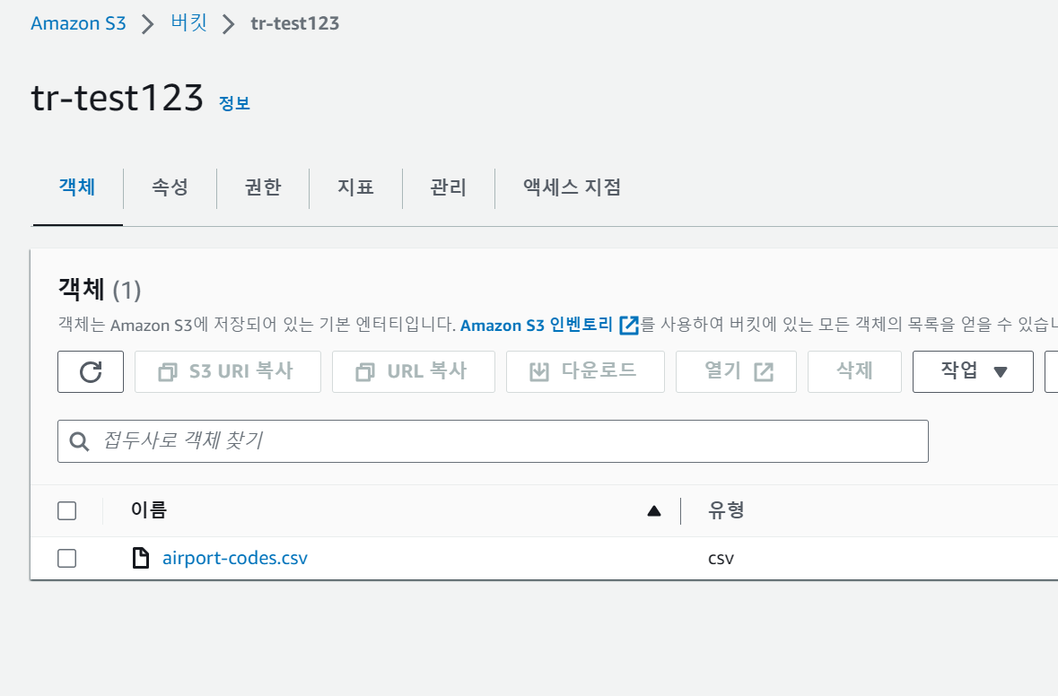 S3에 버킷을 하나 만들고 거기에 해당 CSV 파일을 업로드하였습니다.