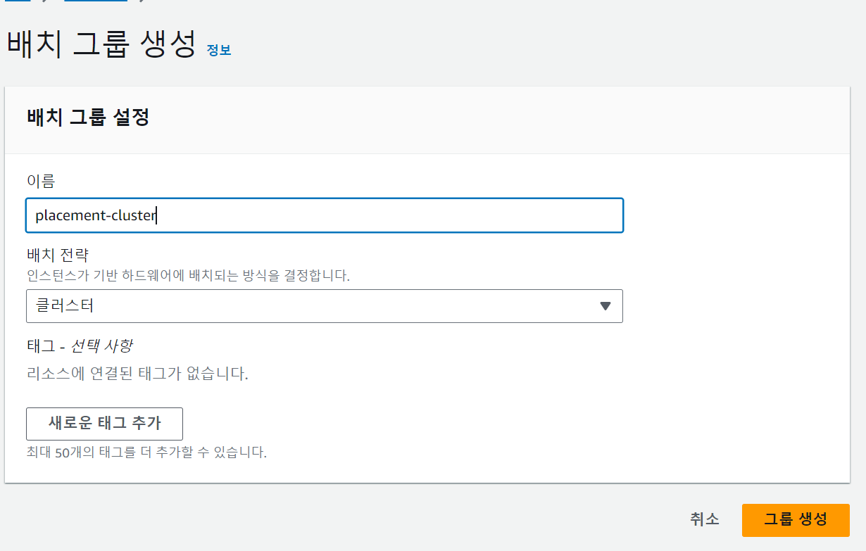 먼저 AZ에 Cluster Placement 1개 생성하겠습니다.