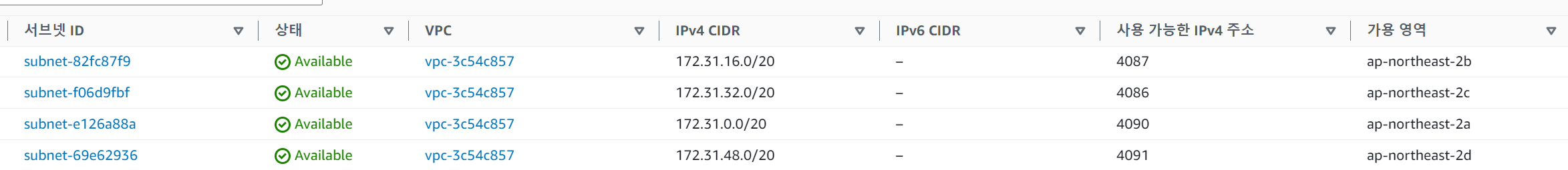 default로 리전내 가용 영역별로 Subnet이 생성되어 있습니다.