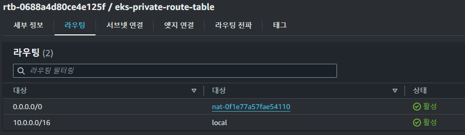 라우트 테이브에 보면 각 인터넷 게이트웨이와 NAT 게이트웨이 설정된 것을 확인할 수 있습니다.