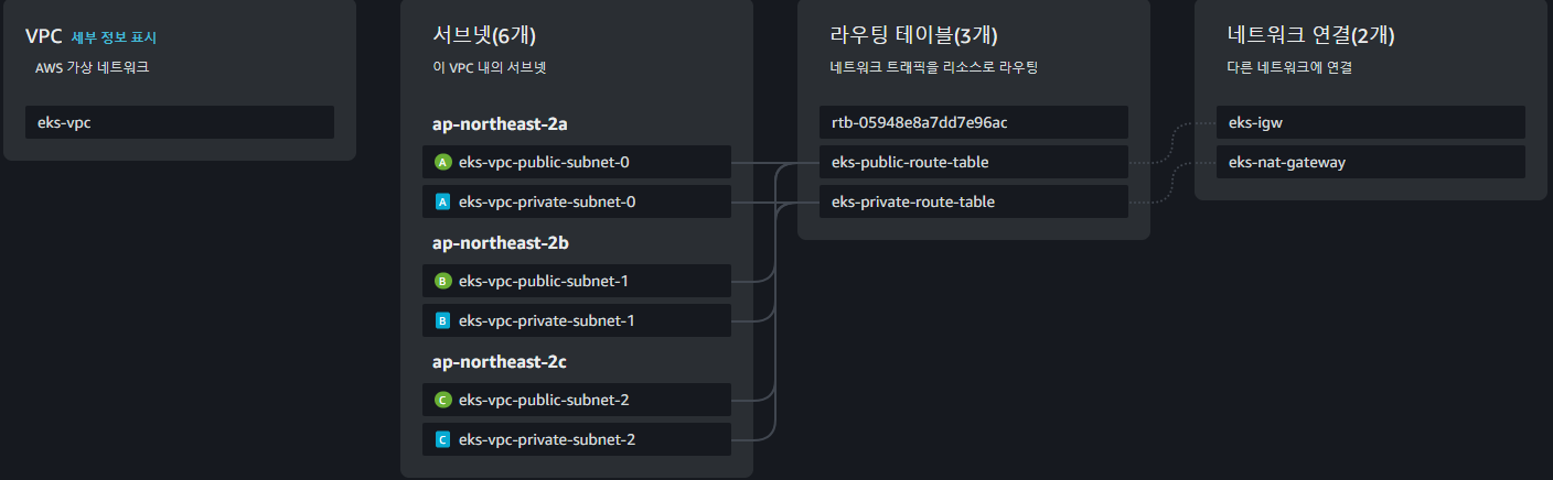 EKS용 VPC가 생성되었고 3개의 가용영역에 각각 2개의 서브넷이 생성된 것을 확인할 수 있습니다.