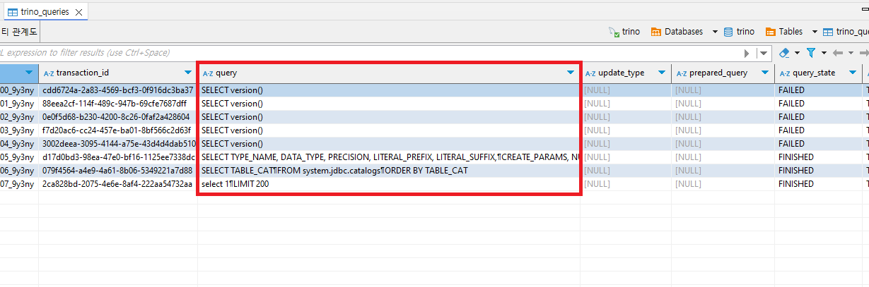 쿼리 후 MySQL trino_queries 테이블을 확인해 보면 쿼리 이력 데이터가 저장된 것을 확인할 수 있습니다.