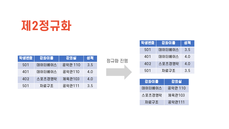 제2정규화는 제1정규화를 진행하고 테이블이 완전 함수 종속을 만족하도록 테이블을 분해하는 것이다.