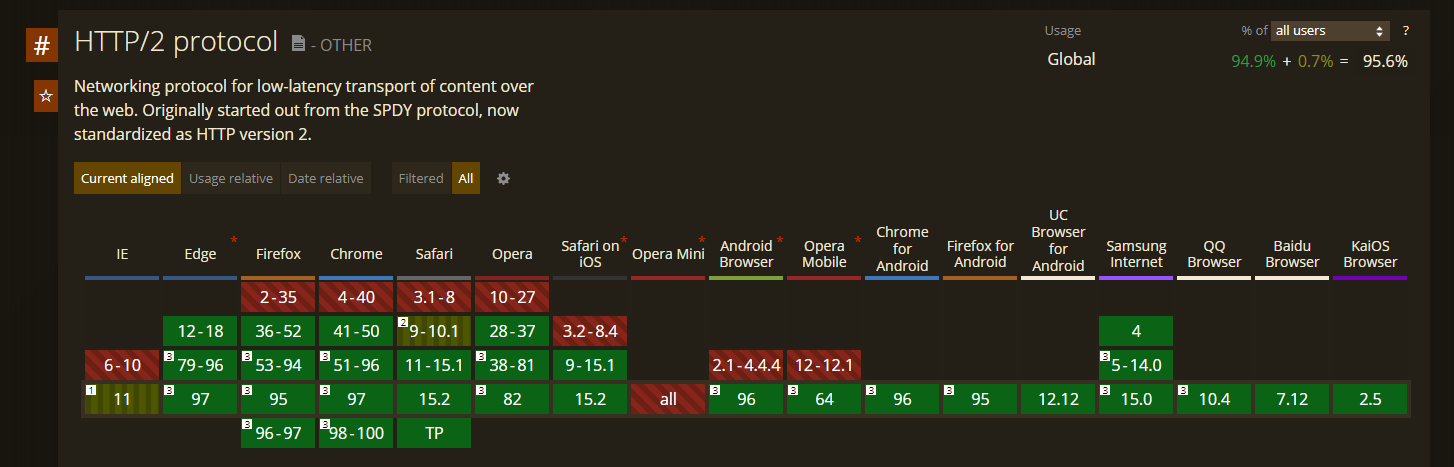 마지막으로 HTTP/2.0 지원은 Web Browser마다 다르니 아래 사진을 참고하길 바란다.