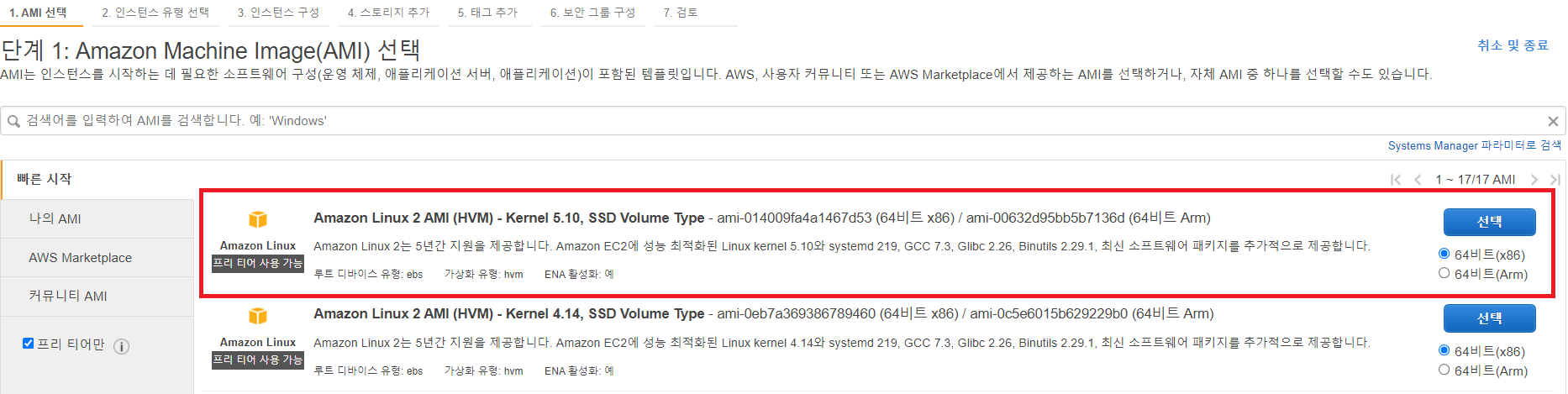 EC2 인스턴스는 Free tier로 할 수 있는 기본적인 AMI 중 하나로 생성하였다.