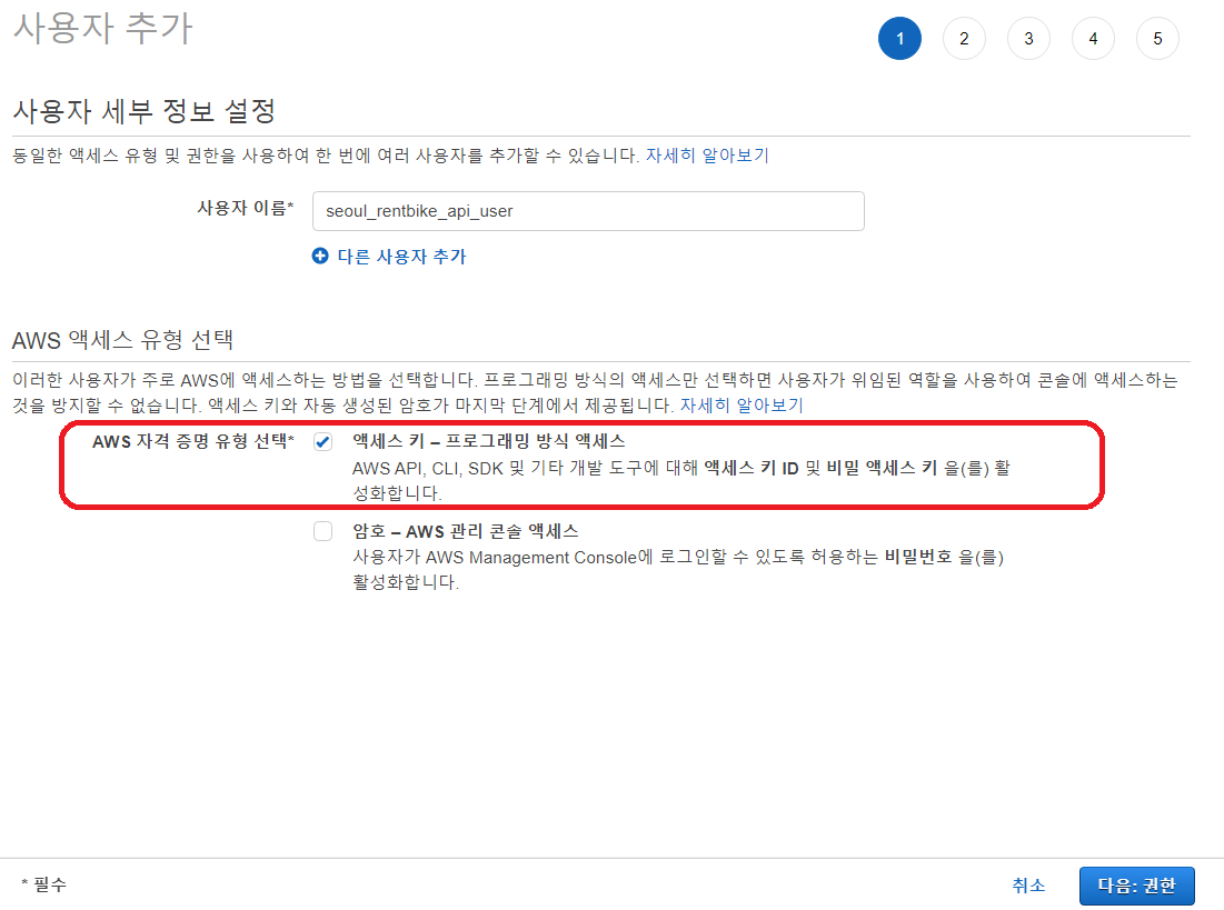 적절한 사용자 이름을 지정해준 다음 AWS 자격 증명 유형을 액세스 키 방식으로 한다.