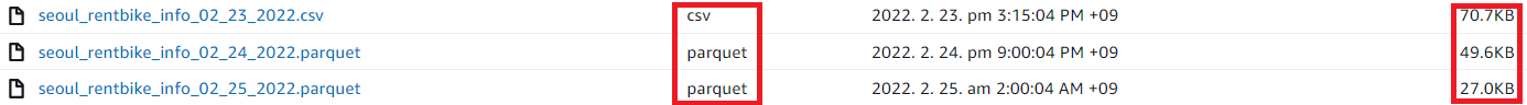 아래는 AWS S3에 CSV와 Parquet 형식 모두 업로드된 따릉이 Data 산출물이다.