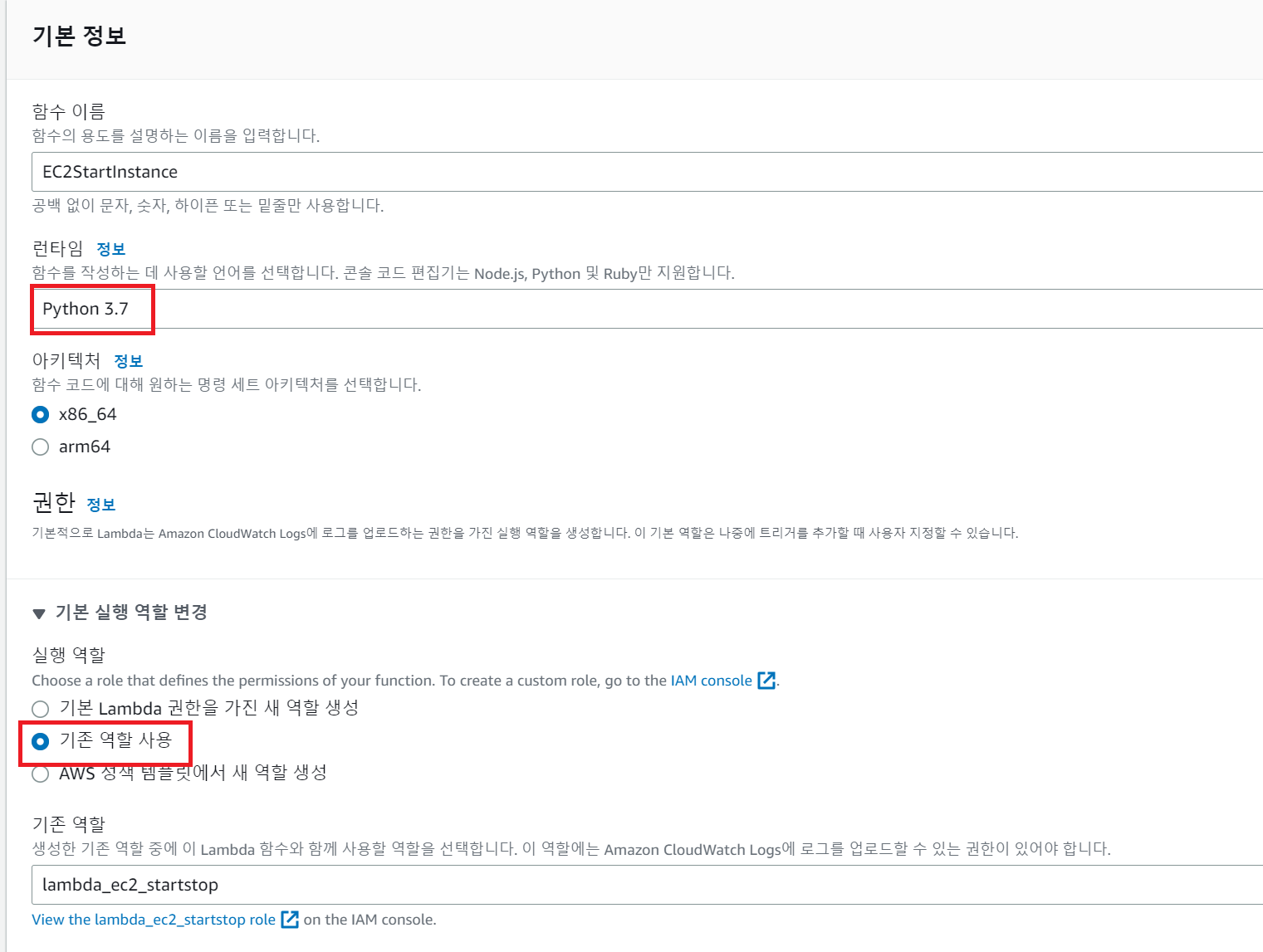 IAM 설정이 완료되면 EC2를 시작하고 중지할 Lambda를 생성합니다.