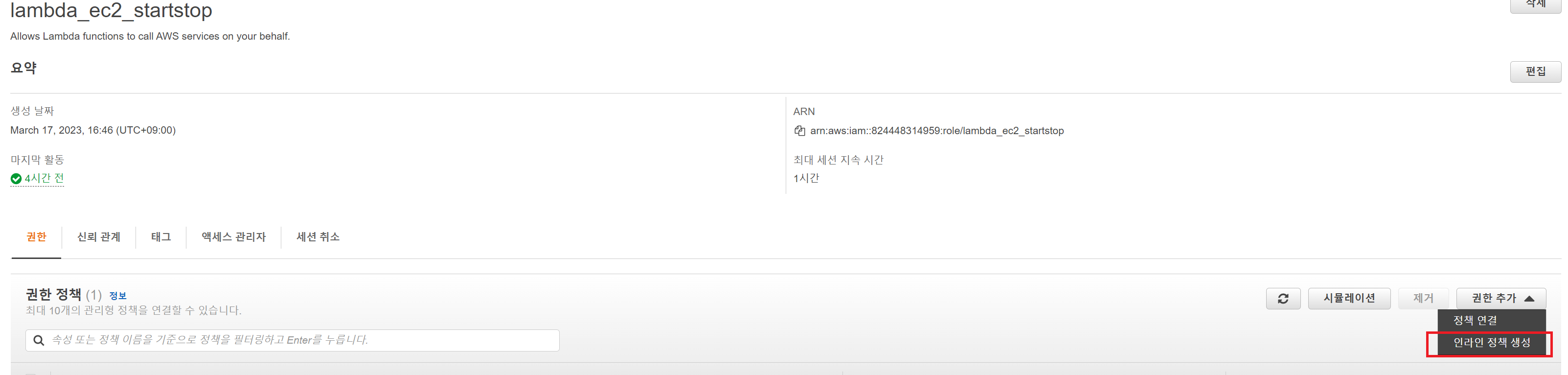 생성한 역할에서 인라인 정책을 생성합니다.